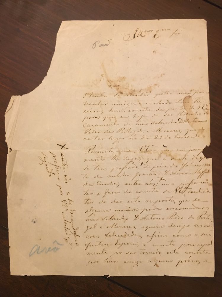 Cópia de Carta da D. José Maria Vasques Álvares da Cunha, Conde da Cunha e Par do Reino, a seu cunhado D. António Maria de Menezes Portugal da Silva, em resposta ao convite feito por este último ao primeiro para padrinho de casamento do sobrinho D. António Maria de Menezes Portugal da Silva com D. Eugénia de Almeida e Vasconcelos.